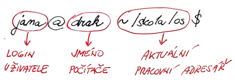 Vzhled promptu je nastavitelný a různý, toto je obvyklé nastavení, které málokdo mění. Před zavináčem je login, tedy přihlašovací jméno uživatele.