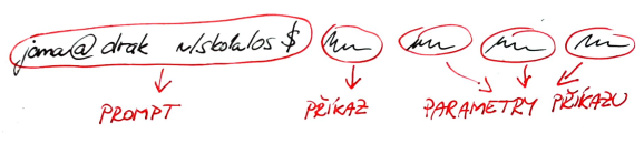 První slovo, které napíšete za prompt, je příkaz, za ním jsou parametry, případně operátory. Příkazy a parametry se oddělují mezerami nebo tabulátory.