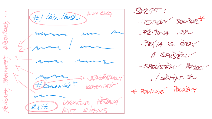 Hlavička, v angličtině shebang nebo sha-bang i hashbang, začíná znakem mřížka, vykřičník a pak je absolutní cesta k interpretu, v našem případě to bude /bin/bash. Ano, kdybyste psali skript v pythonu, bude tam /usr/share/python3. Hlavička není povinná, bude to fungovat i bez ní, ale kdybyste dali takový skript do rukou nepoučeného, pak necháváte na nepoučených rukou, jakému interpretu skript předají. A to nechcete.