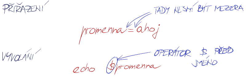 Hodnotu proměnné mohu volat tak, že před její název dám operátor $
