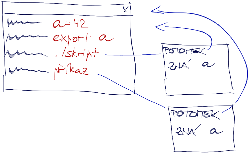 naplní proměnnou a hodnout 42 a exportuje ji. Když si teď vytisknete enviromenální proměnné env, najdete v nich řádek a=42.