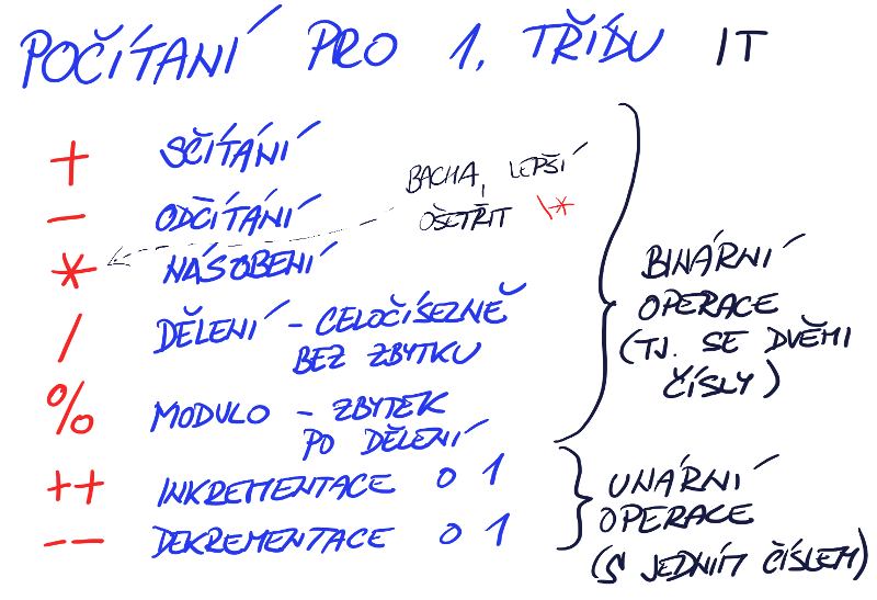 sčítat +, odčítat -, násobit \*, celočíselně dělit / a modulo, tedy zbytek po dělení %