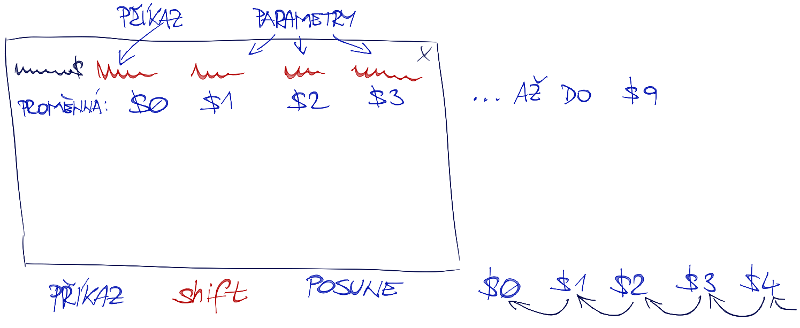 K takto uloženým parametrům můžete přistupovat až do proměnné $9. Pro hromadné zpracování se hodí příkaz shift, který z proměnné $1 udělá $0, z proměnné $2 udělá $1, atd.