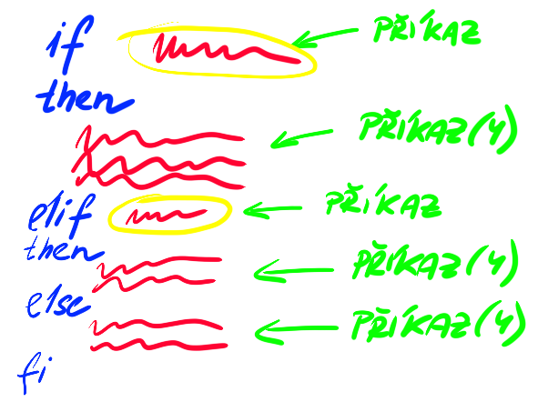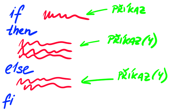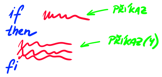 Syntaxe nejmenší použitelná je nakreslena na obrázku: Je-li splněn v pořádku příkaz (jeho exit status je nulový), pak se provádí příkazy.