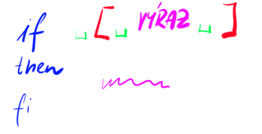 Varianta, ve které píši za if příkaz, je sice oblíbená, ale někdy chcete konat na základě toho, že něco spočítáte, porovnáte řetězce nebo se podíváte na vlastnosti souboru. K tomu slouží výraz, jehož syntaxe je taková, že jej uzavřete do hranatých závorek (ty poctivě oddělíte mezerami od zbytku kódu) a bash jej vyhodnotí, jestli je pravdivý nebo ne.