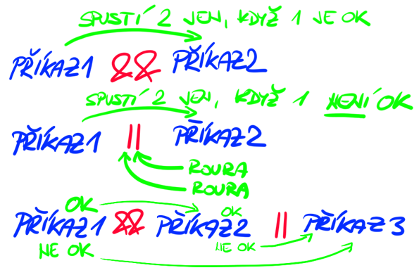 Nemusíme nutně hned odejít do skriptu, abychom něco spustili podmíněně. Operátor && umí spustit příkaz pouze v případě, že příkaz před ním skončí úspěšně. Naopak operátor || umí spustit příkaz pouze v případě, že příkaz před ním skončí neúpěšně