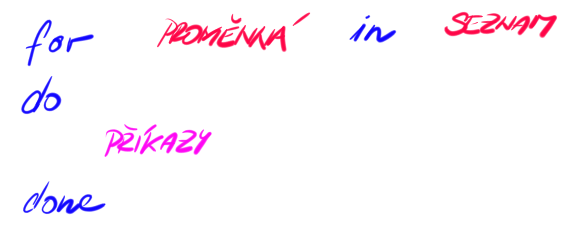 Syntaxe je for je taková, že definujete nějakou proměnnou, přes kterou chcete, aby cyklus iteroval, a pak zadáte seznam hodnot, kterých má proměnná nabývat.