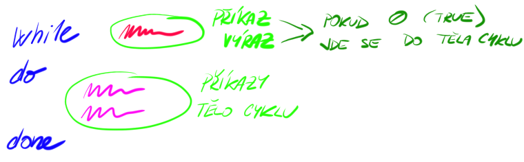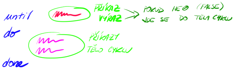 Bash rozeznává příkazy while a until, které jsou vlastně stejné a zároveň zcela opačné. while provádí tělo cyklu, pokud je podmínka splněna, until provádí tělo cyklu, dokud podmínka není splněna. Jak si to zapamatovat? Třeba tak, že si pamatuju nekonečnou smyčku: